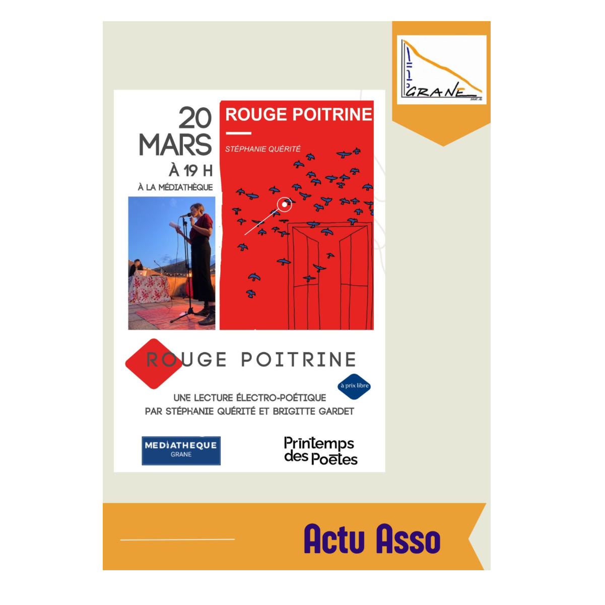 La Médiathèque de Grâne accueille deux artistes du territoire pour une lecture musicale du recueil Rouge Poitrine, de Stéphanie Quérité, mis en musique par Brigitte Gardet.